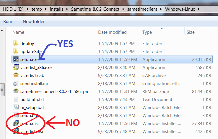 Ok gang, here's a quick tip that should save you loads of time. When installing IBM Lotus Sametime Connect on 64bit Windows 7, make sure you launch the correct installer. If your instincts tell you to launch setup.msi, they are lying to you. Don't waste your time. Directly launching setup.msi on 64bit Windows 7 will cause the installer to fail (telling you it was interrupted) halfway through the installation. Use setup.exe instead. Yes, setup.exe will eventually call setup.msi -but it will do so without failing and your installation will succeed.